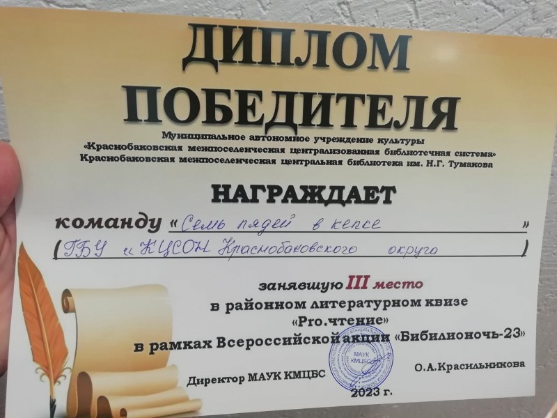 Команда ГБУ «КЦСОН Краснобаковского муниципального округа» приняла участие в районной интеллектуальной игре «100% интеллект», посвященной классической и советской литературе, в рамках всероссийской акции «Библионочь», проходившего в центральной библиотеке им. Н.Г. Тумакова р.п. Красные Баки.