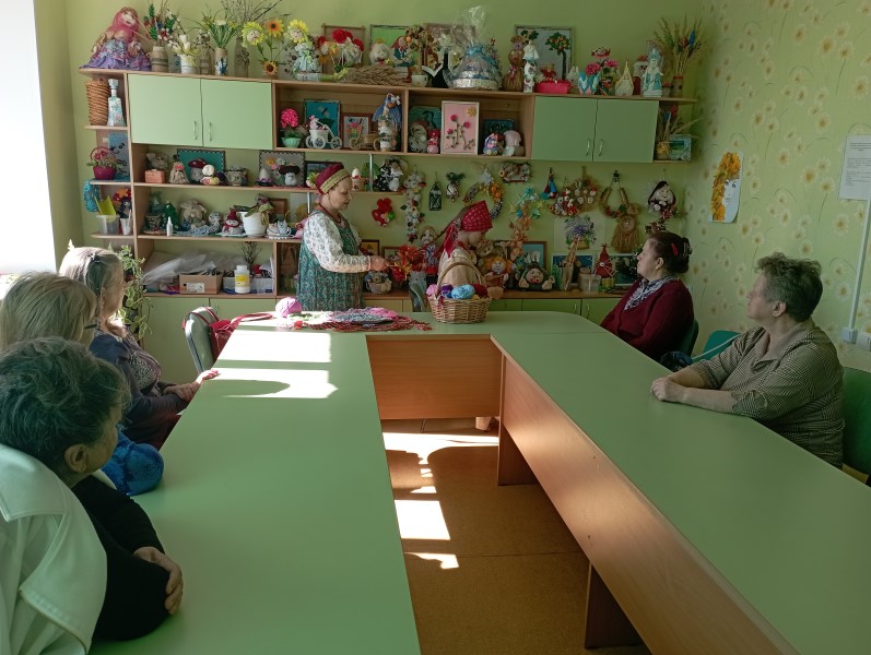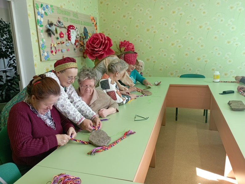 В гостях у обслуживаемых Отделения дневного пребывания побывали специалисты из РЦД и К с познавательной интерактивной беседой по русскому народному костюму, а также созданию его ярких элементов. Занятие началось с обсуждения темы девичьего головного убора с наглядной демонстрацией плетения русской косы, а закончилось мастер-классом по плетению пояса кушака, который является неотъемлемой частью народного костюма. В ходе творческого процесса обслуживаемые вместе со специалистами вспомнили старину, поговорили о традициях, а также прикинули, как яркий поясок можно превратить в стильный элемент современного женского гардероба.