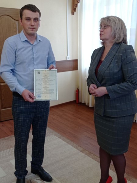 Заведующая ЗАГС Титова С.В. вручила счастливому отцу новорожденной ее первый документ – свидетельство о рождении.
