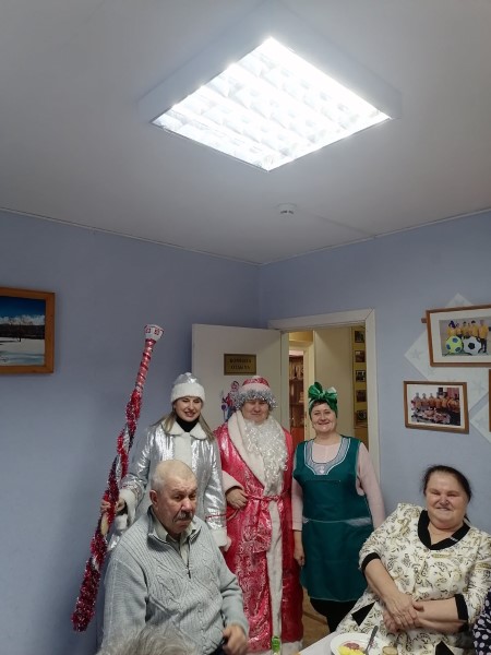 Для жителей отделения Спецжилдом проведена праздничная новогодняя программа с элементами развлекательной игры «Новый год приходит в дом». В уютной обстановке все участники мероприятия побывали в сказочной стране Веселяндии. Разгадывали тайну счастливого Нового года и соревновались в умении танцев по-новогоднему. Играли в различные конкурсы, пели любимые песни, читали стихи и пили чай со сладостями. А в завершение программы получили поздравления от Деда Мороза и Снегурочки, поводили хоровод, и сделали с ними фото на память.