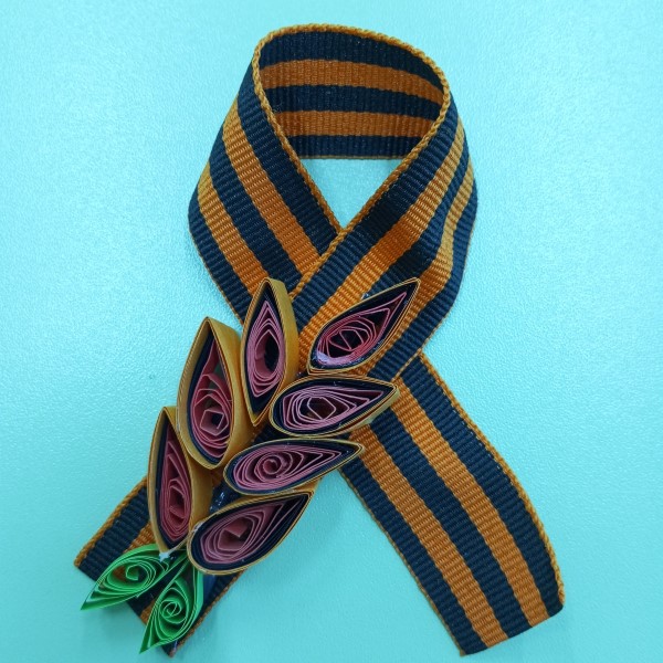 Техника квиллинга привнесла некую изюминку и изготовить георгиевскую ленту с интересными элементами и деталями из бумаги для наших обслуживаемых было совсем несложно, они с увлечением совместили в своей работе разные материалы: ткани (ленты) и бумаги при выполнении лепестков.
