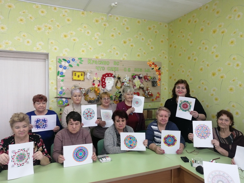 Психолог С.В. Алимова провела в Отделении дневного пребывания ГБУ «КЦСОН Краснобаковского муниципального округа» занятие по мандала-терапии – простому и эффективному методу, доступному даже для пожилых людей. Мандала-терапия позволяет работать с подсознанием, снимать напряжение и выражать чувства, способствуя саморегуляции и обретению внутренней гармонии. Участники создали собственные мандалы, дав им названия, а затем обсудили и интерпретировали свои работы. После занятия участники отметили улучшение настроения и снижение тревожности, а также выразили желание продолжать практику мандала-терапии дома.