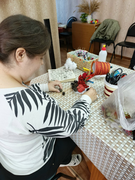 Отдыхающие отделения дневного пребывания изготовили осенний топиарий "Парящая чашка".