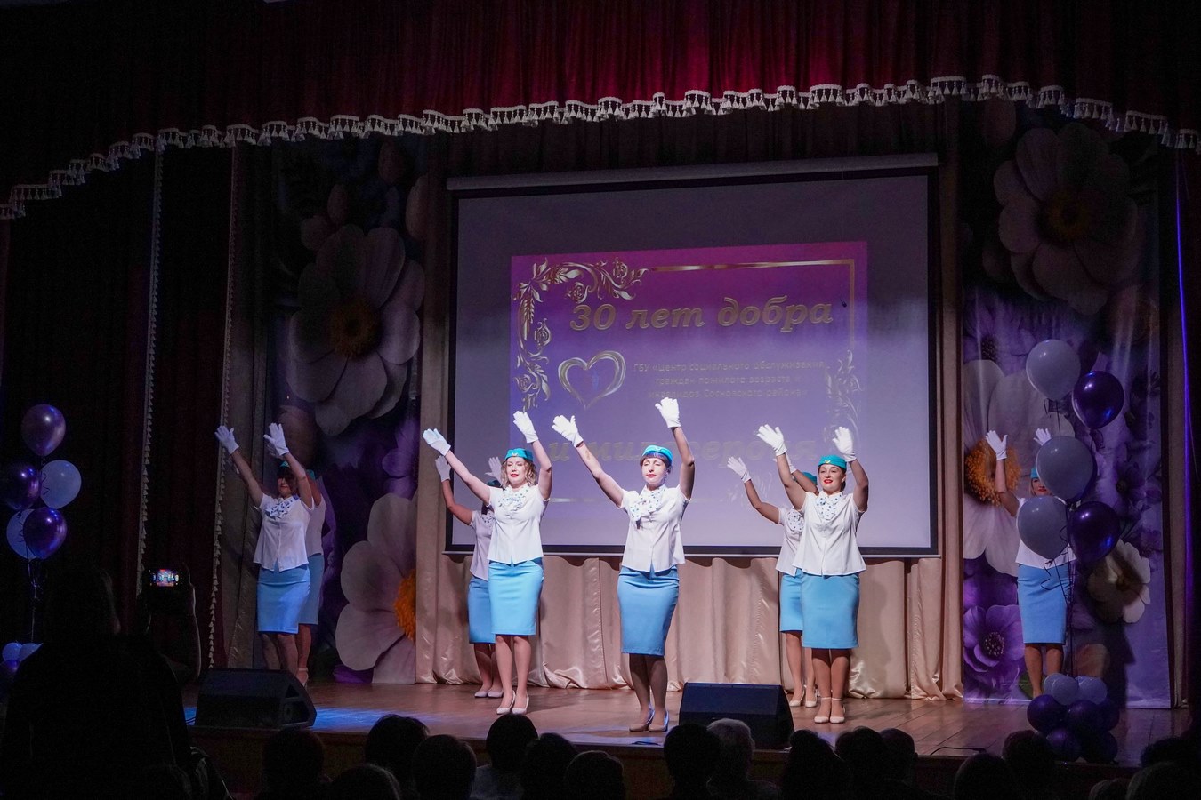 В культурном центре «Березка» состоялся грандиозный праздник — Центр социального обслуживания отметил своё тридцатилетие. Гостей встречали приветливые «стюардессы», ведь торжество прошло в необычном формате «праздничного юбилейного полета».